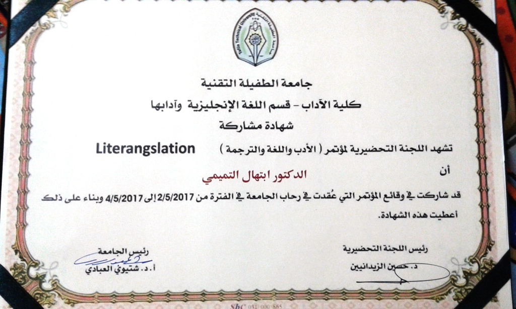 شاركت التدريسية بقسم اللغة الانكليزية في كلية اللغات أ.م.د. ابتهال التميمي في اعمال المؤتمر الدولي المحكم للادب واللغة والترجمة التي عقد في جامعة الطفيلة الاردنية للمدة 2 – 4 آيار 2017 .