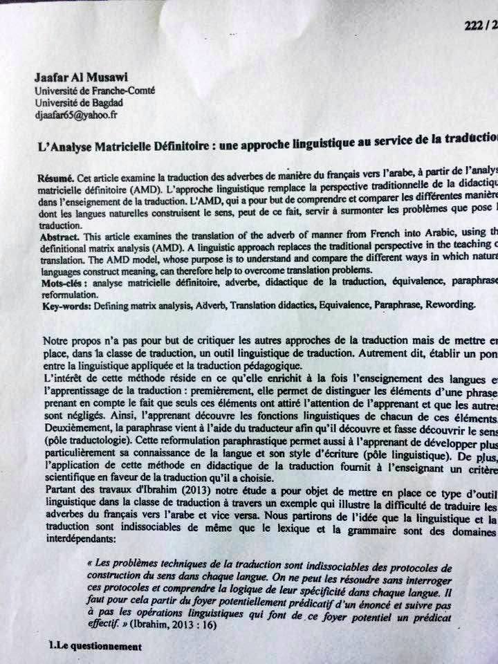 أختير بحث التدريسي بقسم اللغة الفرنسية في كلية اللغات م.د. جعفر عبد الزهرة الموسوي من بين 28 بحثاً للنشر في مجلة مركز البحوث اللغوية CRL التي تصدر عن جامعة السوربون الفرنسية .