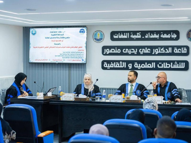 ناقش قسم اللغة الإنجليزية في كلية اللغات بجامعة بغداد يوم الثلاثاء الموافق 22 تموز 2025، رسالة الماجستير الموسومة (التحليل النقدي متعدد الوسائط لمدونات الطعام باللغتين الإنجليزية والعربية) للطالبة نور حامد عبد السادة.