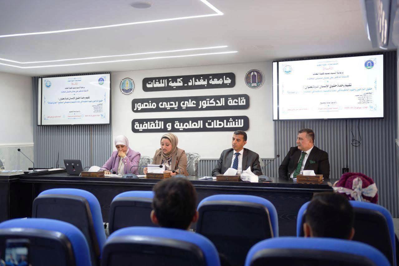 اقامت شعبة حقوق الانسان في كلية اللغات بجامعة بغداد ندوة علمية بعنوان (حقوق النازحين وجهود الحكومة في اعادة تأهيلهم ودمجهم في المجتمع: العراق انموذجاً)، شارك فيها كل من أ.م.د.ارواء فخري عبد اللطيف وأ.م.د.سناء خداكرم عزيز) وأم.د.عمر إبراهيم محمد وم.د.فاضل عباس جبار وم.د.عباس فاضل محمود، بحضور عدد من اساتذة وموظفي الكلية.