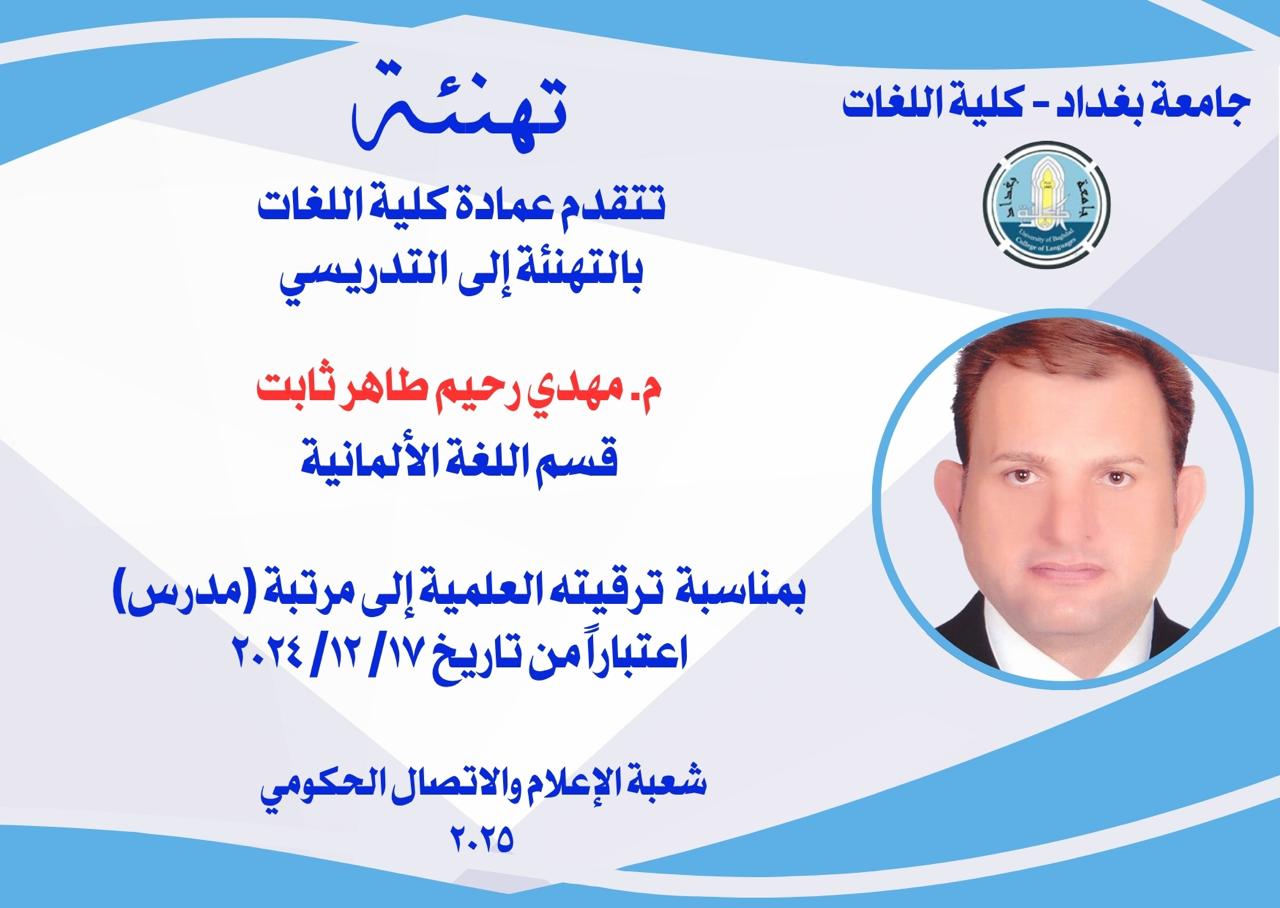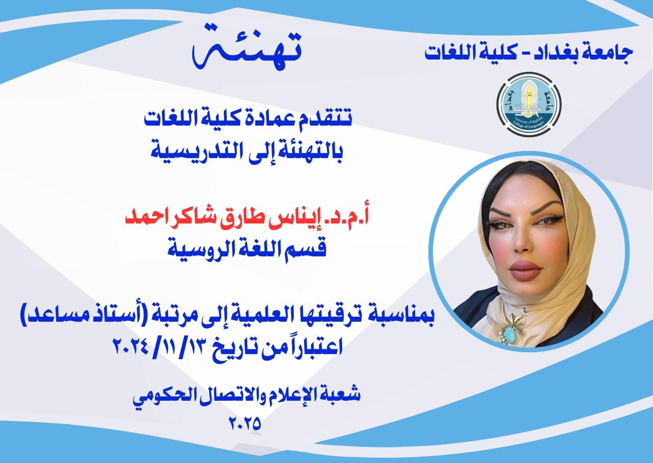 تتقدم عمادة كلية اللغات إلى الاستاذ المساعد الدكتورة (ايناس طارق شاكر) التدريسية في قسم اللغة الروسية بالتهنئة بمناسبة حصولها على الترقية العلمية إلى مرتبة (استاذ مساعد) في اختصاص اللغة الروسية/ اللغة، وإلى المدرس (مهدي رحيم طاهر ثابت) التدريسي في قسم اللغة الالمانية بمناسبة حصوله على الترقية العلمية إلى مرتبة (مدرس) في اختصاص اللغة، متمنين لهم دوام التوفيق والسداد في خدمة المسيرة العلمية.