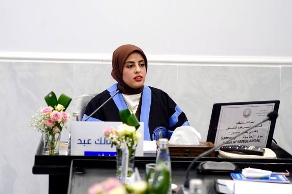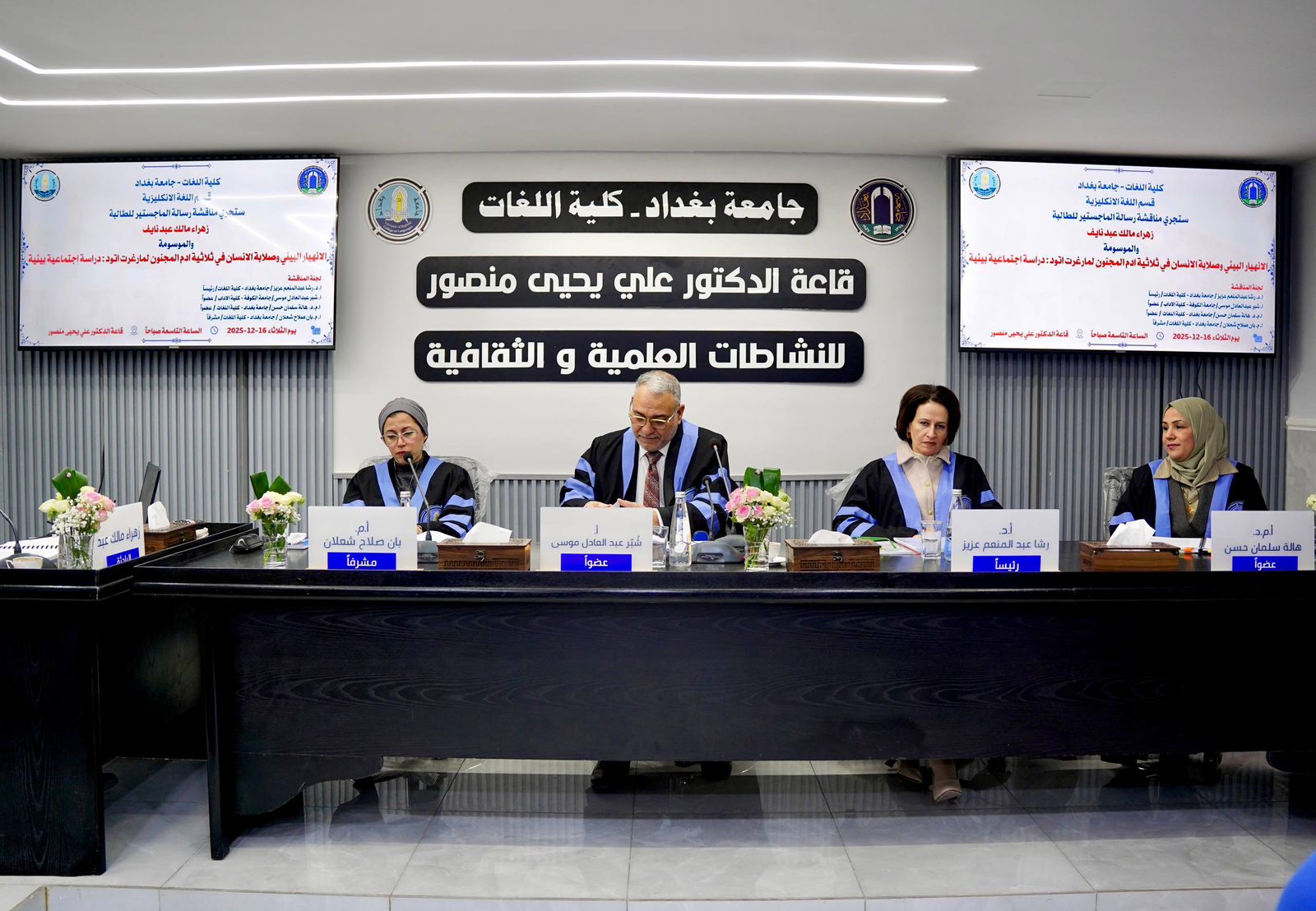 ناقش قسم اللغة الانكليزية في كلية اللغات بجامعة بغداد رسالة الماجستير الموسومة (الانهيار البيئي وصلابة الانسان في ثلاثية “آدم المجنون” لمارغريت اتود : دراسة اجتماعية بيئية) للطالبة زهراء مالك عبد نايف.