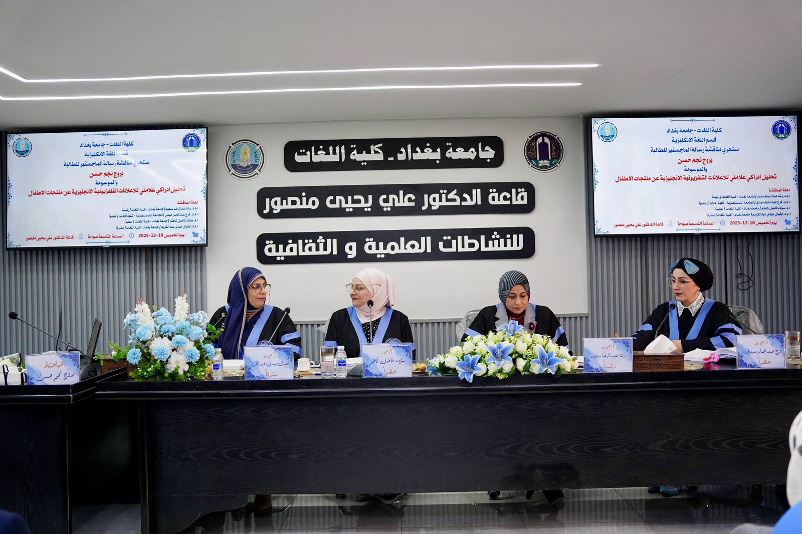 ناقش قسم اللغة الانكليزية في كلية اللغات بجامعة بغداد رسالة الماجستير الموسومة (تحليل ادراكي علاماتي للإعلانات التلفزيونية الانجليزية عن منتجات الاطفال) للطالبة بروج نجم حسن.
